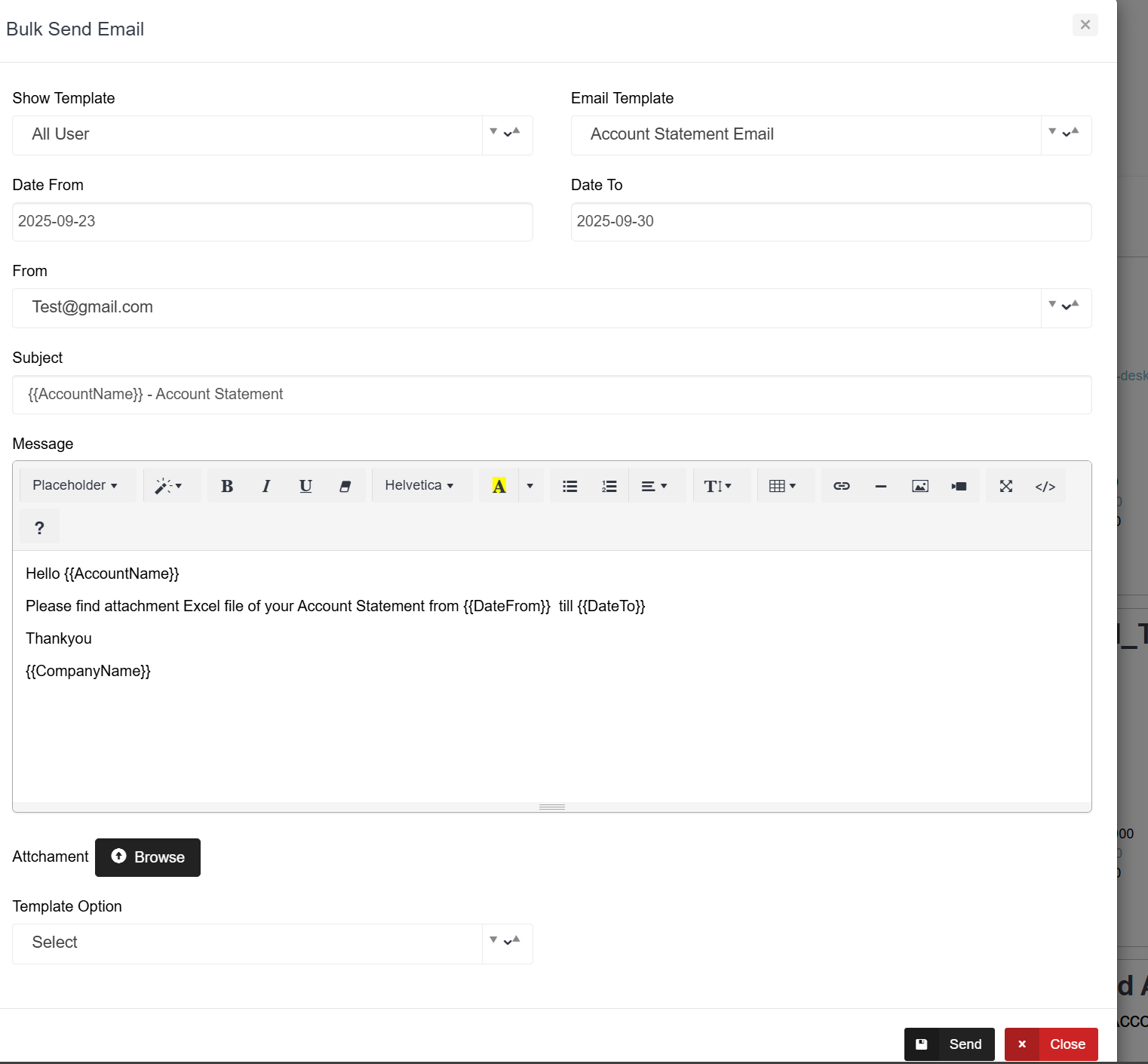 - Email Template: Drop-down list of available templates(Select Account Statement Email).