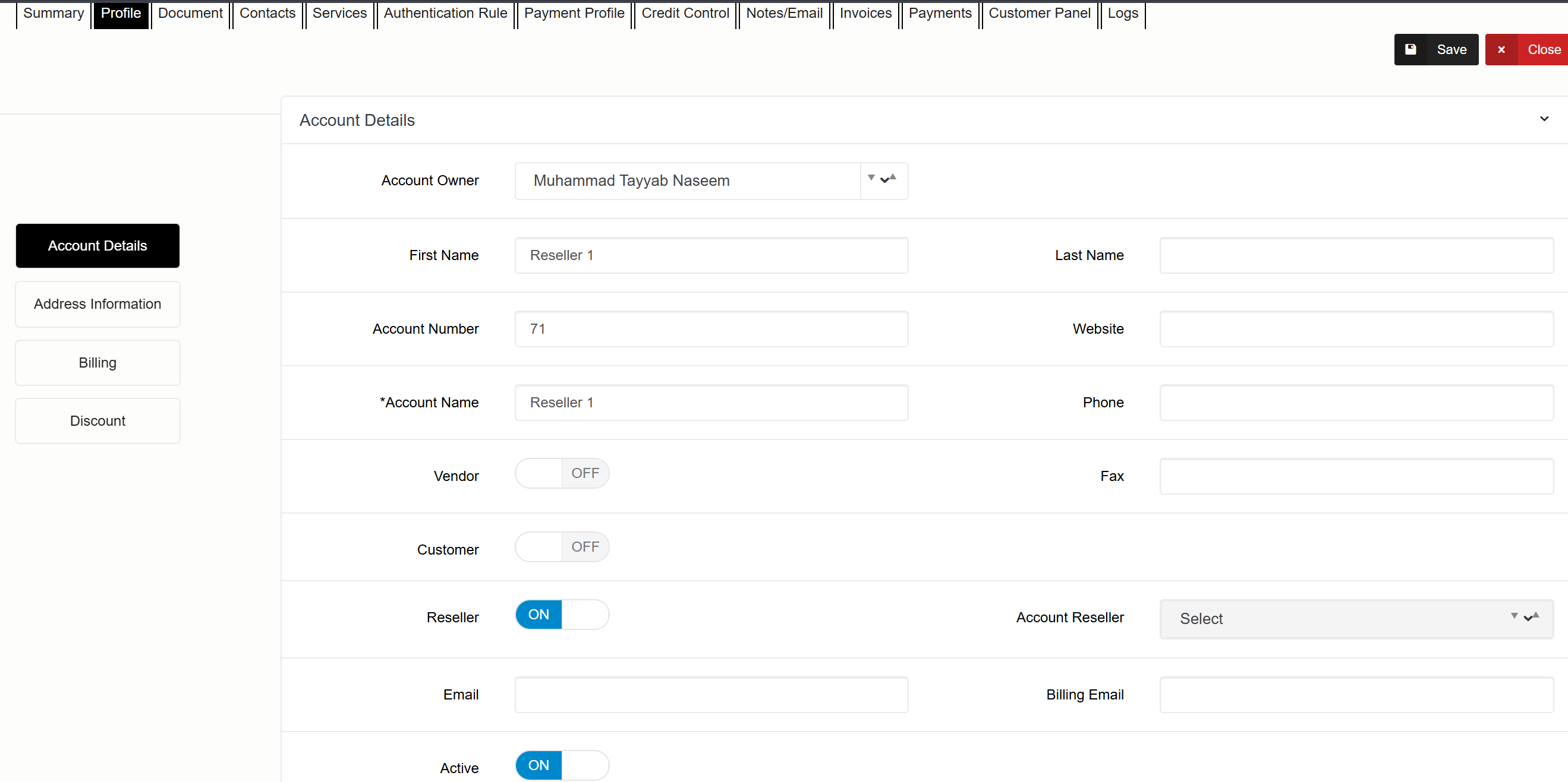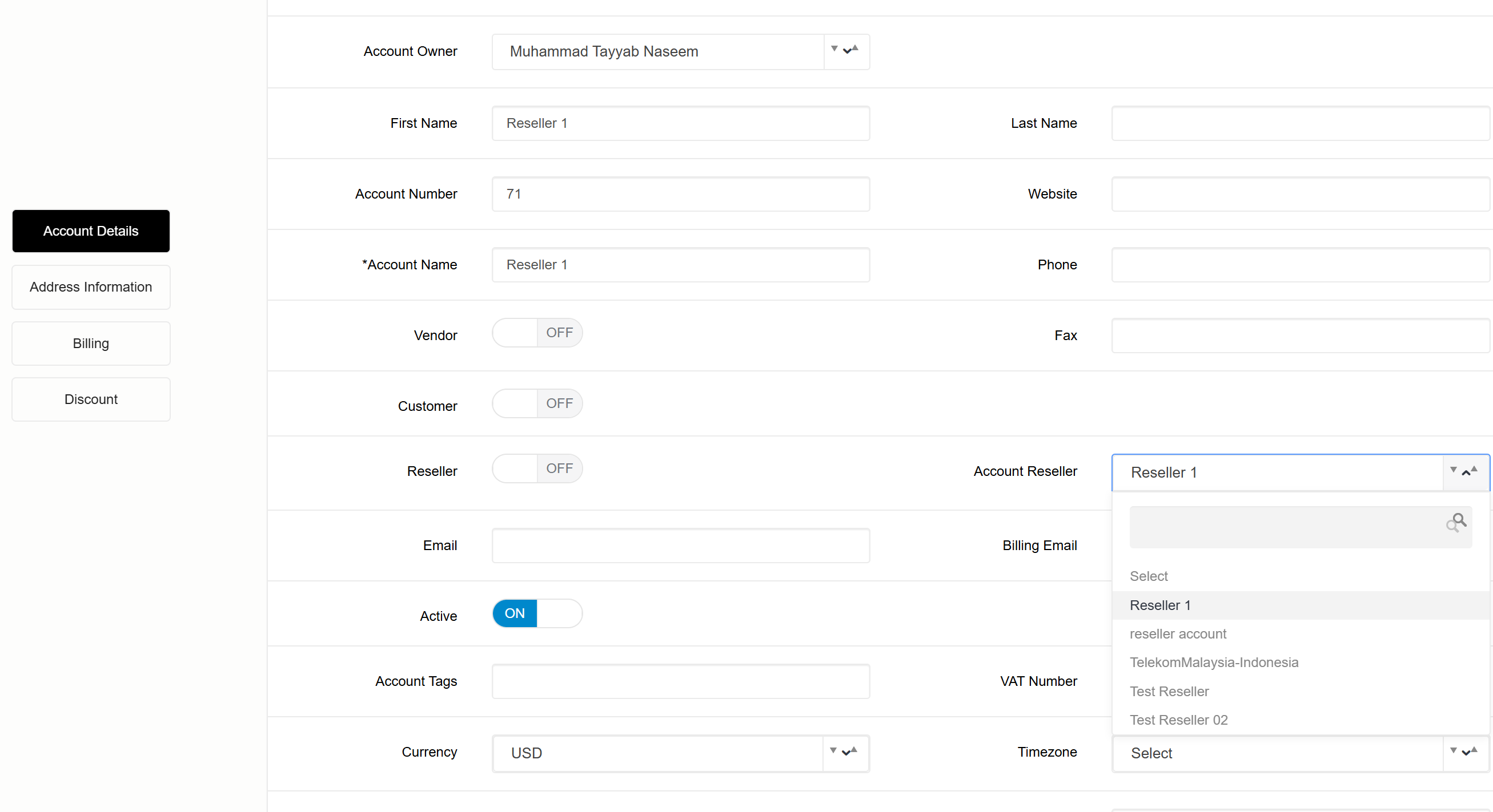 To Assign specific customer accounts to Reseller Account, make sure the reseller toggle is off ,then select specific reseller from the account reseller dropdown for any specific customers under that reseller