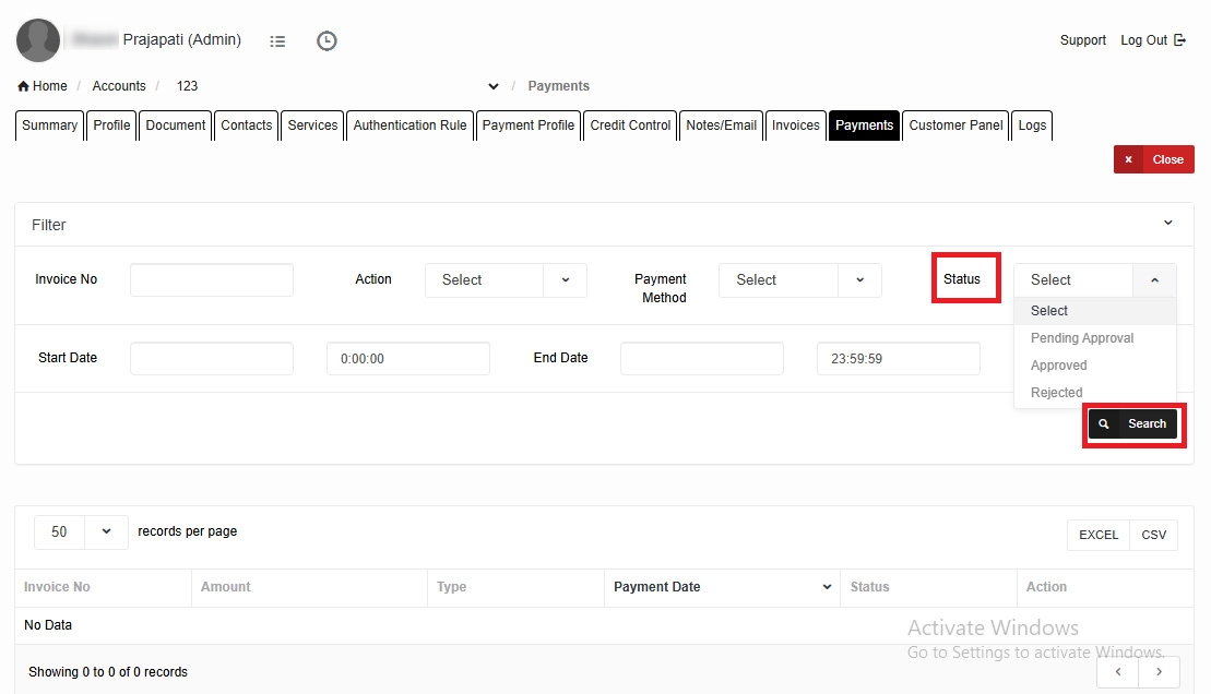 6: When apply the Status Filter and click on the Search button, the system displays only the data that matches the selected status.
