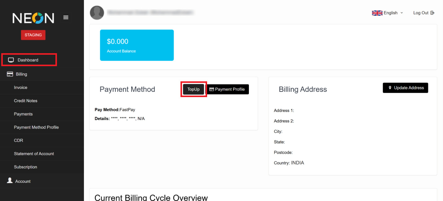 Login to your account, and on the left sidebar menu, go to the Dashboard and click on the TopUp