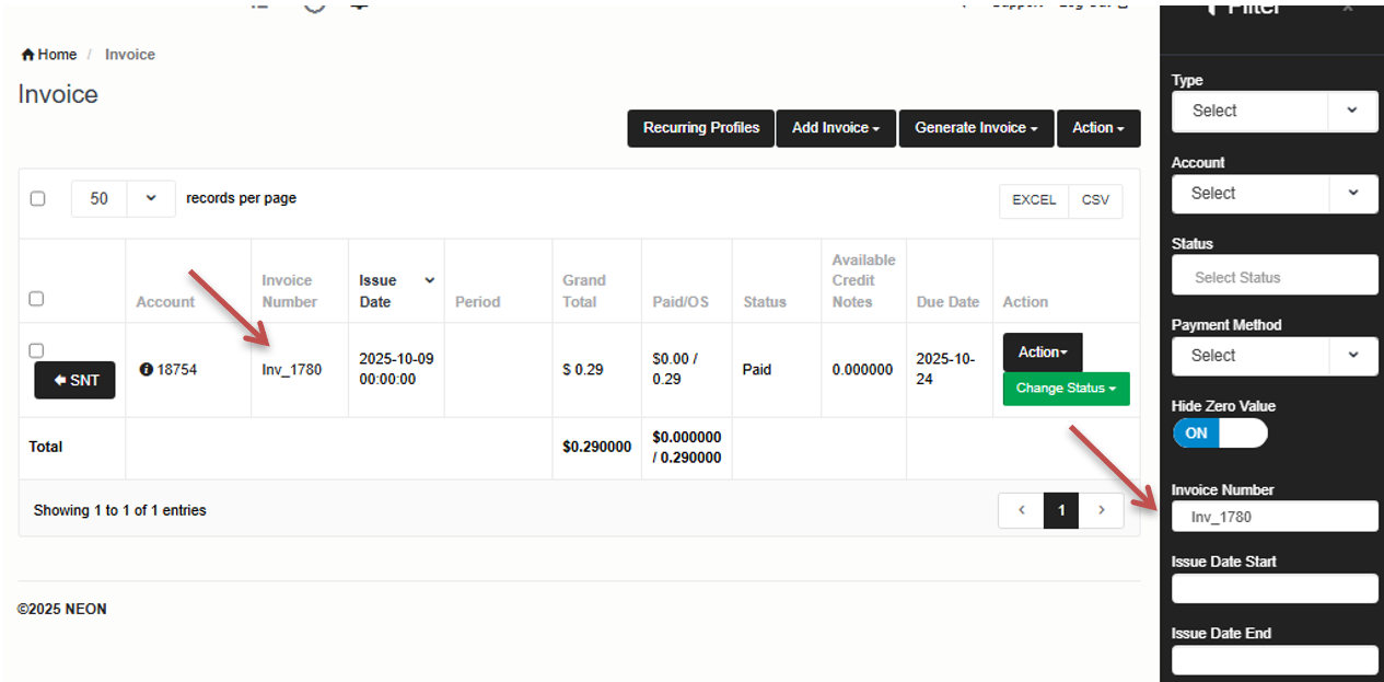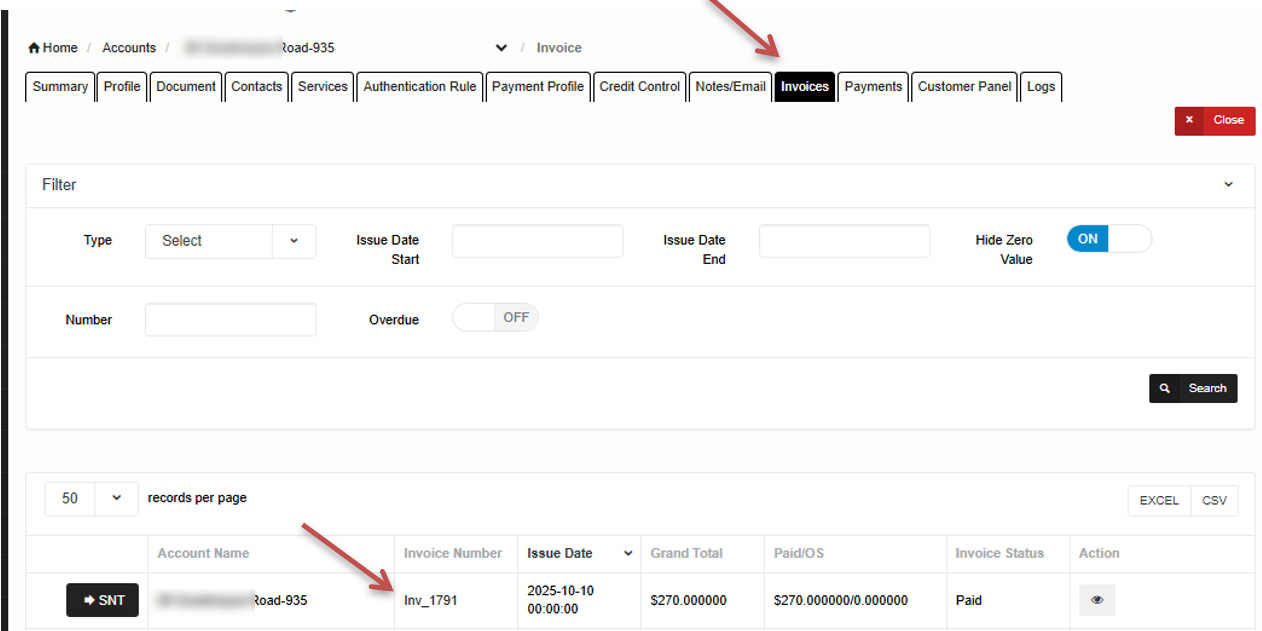 5 .On the Invoice page, you will see the filter automatically set to that specific invoice number.