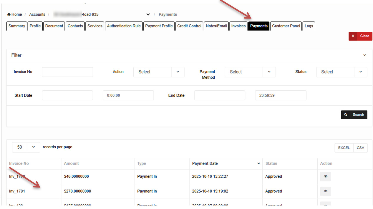 - Clicking an Invoice Number on the Payments page automatically redirects to the Invoice page.