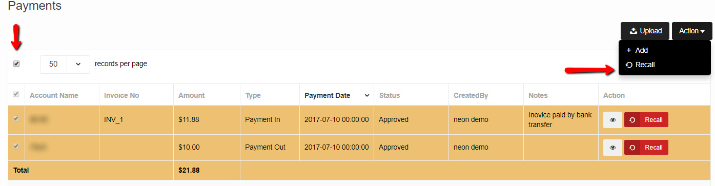 Click on Action > Add to create new payment. Enter required details and click on save.