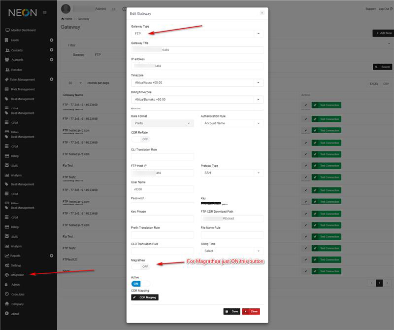 We are using FTP integration as Magrathea integration, first we will setup FTP integration like same before, FTP mapping etc. So for Magrathea we will ON the button in gateway form otherwise we will set OFF.