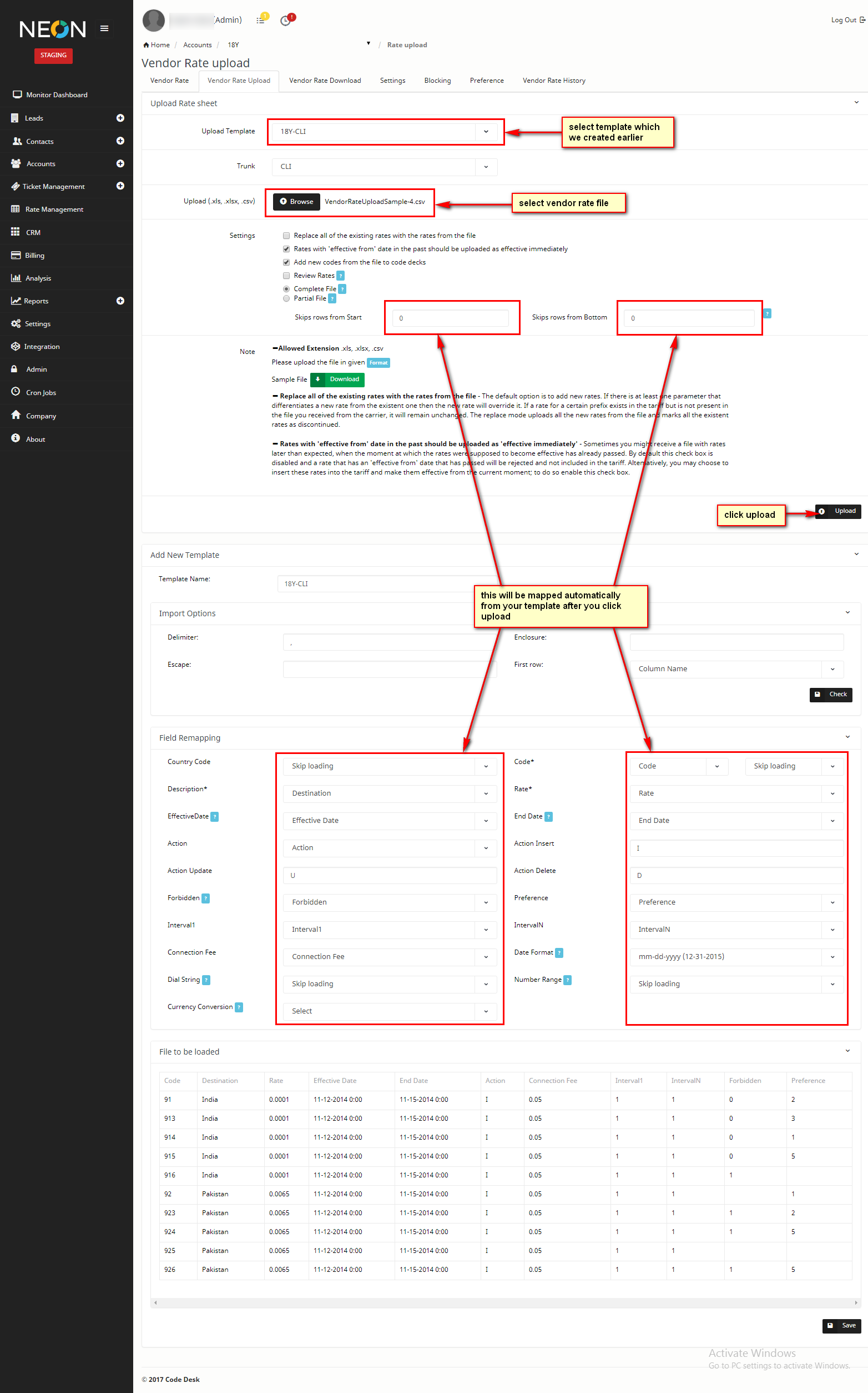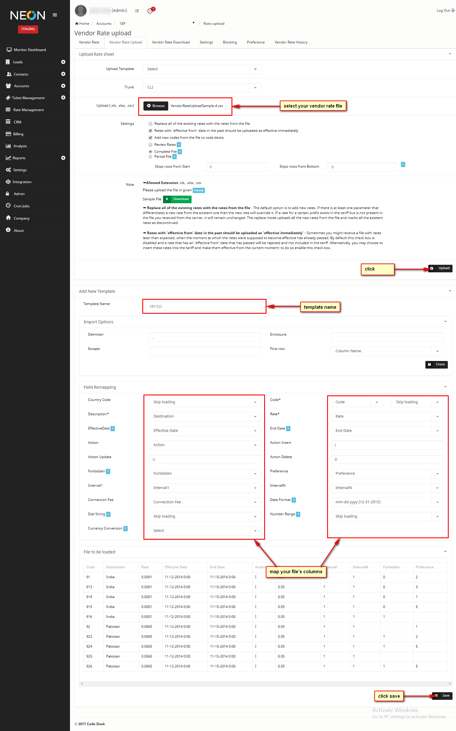 In order to setup Vendor Upload template go to Account->Vendor->Vendor Rate Upload.